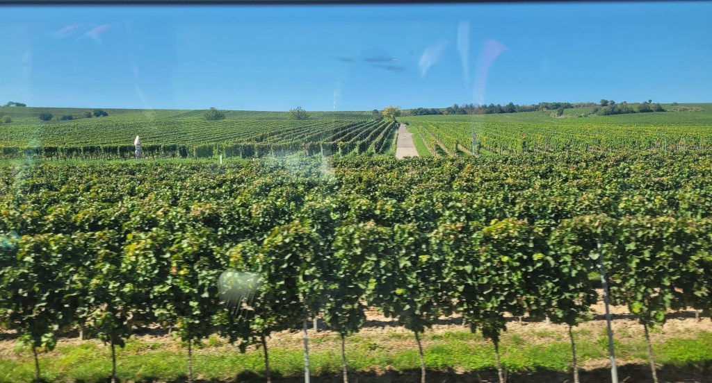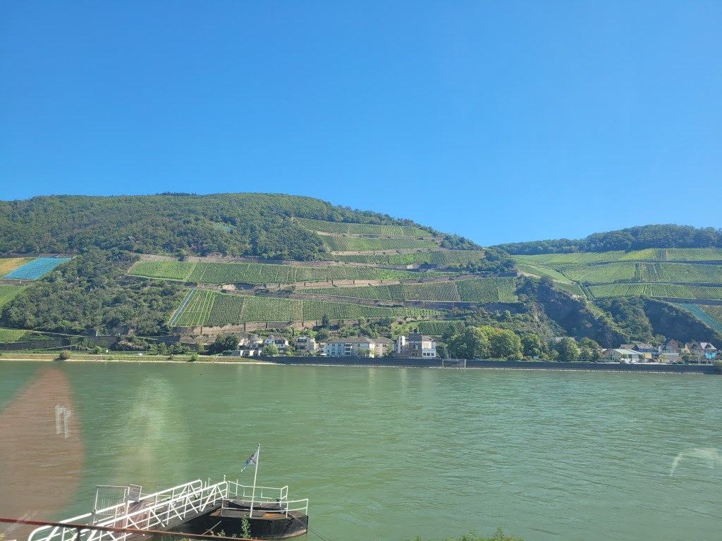 From Mainz, the scenery expanded, losing the sheer rocky slopes, and the train moved slightly away from the river. You could still catch glimpses of it but mostly it’s vines to the left of us, vines to the right of us and probably vines in front of us. Think of all those bottles of wine!