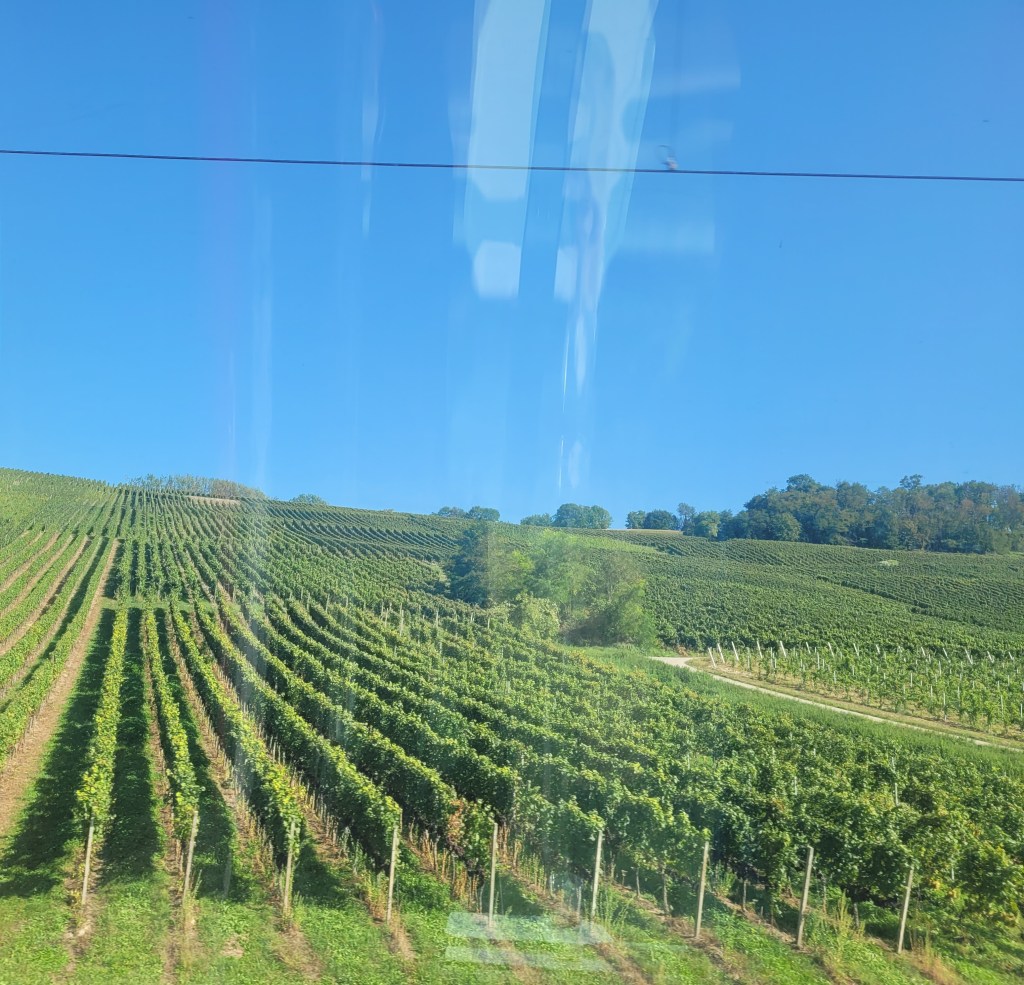 Leaving Trier, we trundled through lots of greenery, with deeply red earth showing here and there where the fields had been plowed, contrasting the bright blue sky. Colour, sun, first class tickets, a spotlessly clean train that left almost on time… What’s not to like?