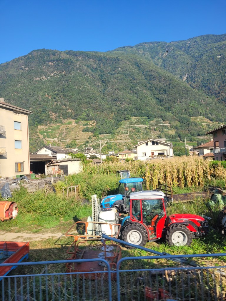 Out of Tirano, the fields became larger and more organised, with haphazard patches of cereal crops replaced by orderly rows of dark green leaved small trees laden with heavy clusters of either red or yellow fruits. Red and Golden Delicious? Behind them, more vines – again, ranging up the mountain. This looked more commercial.