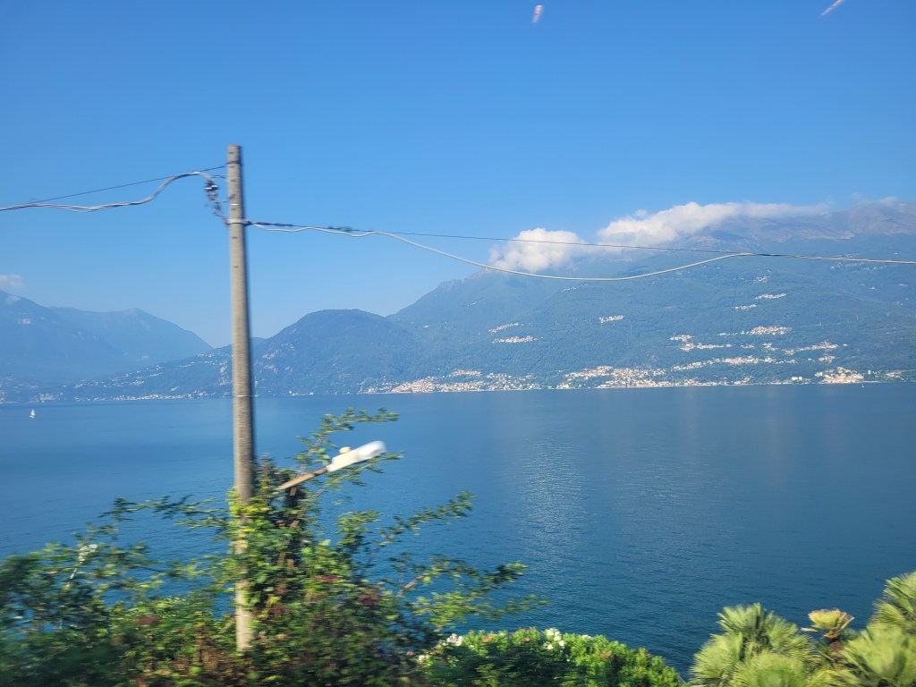 The train skirted Lake Como, inconveniently popping into a tunnel, behind a building or through dense shrubbery just as the photo opportunities improved. It’s enormous, built up, but lovely. Again… mountains.