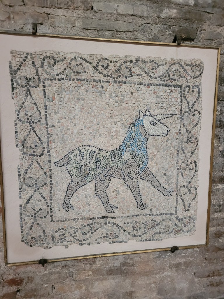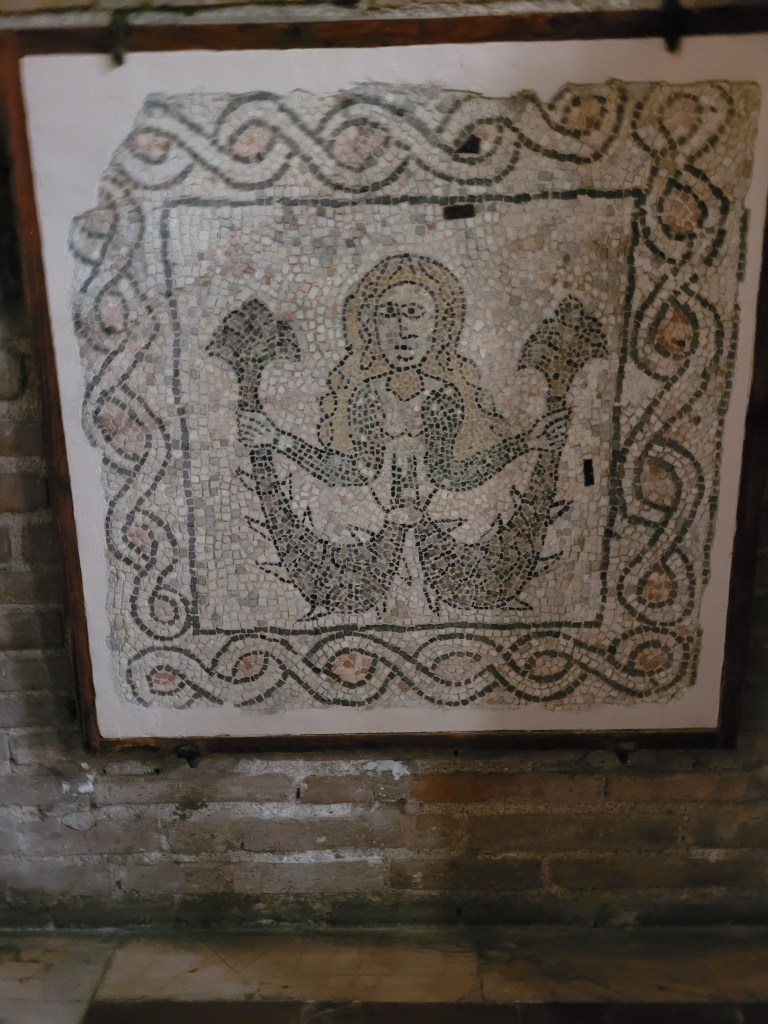 Ravenna does have some Roman mosaics, discovered when investigating the drainage under a (you guessed it) church (but not an early one this time). They are on show, and what is noticeable is the high-tec excavation and presentation, versus the general decrepitude of the church above them – there was ivy growing through the windows.