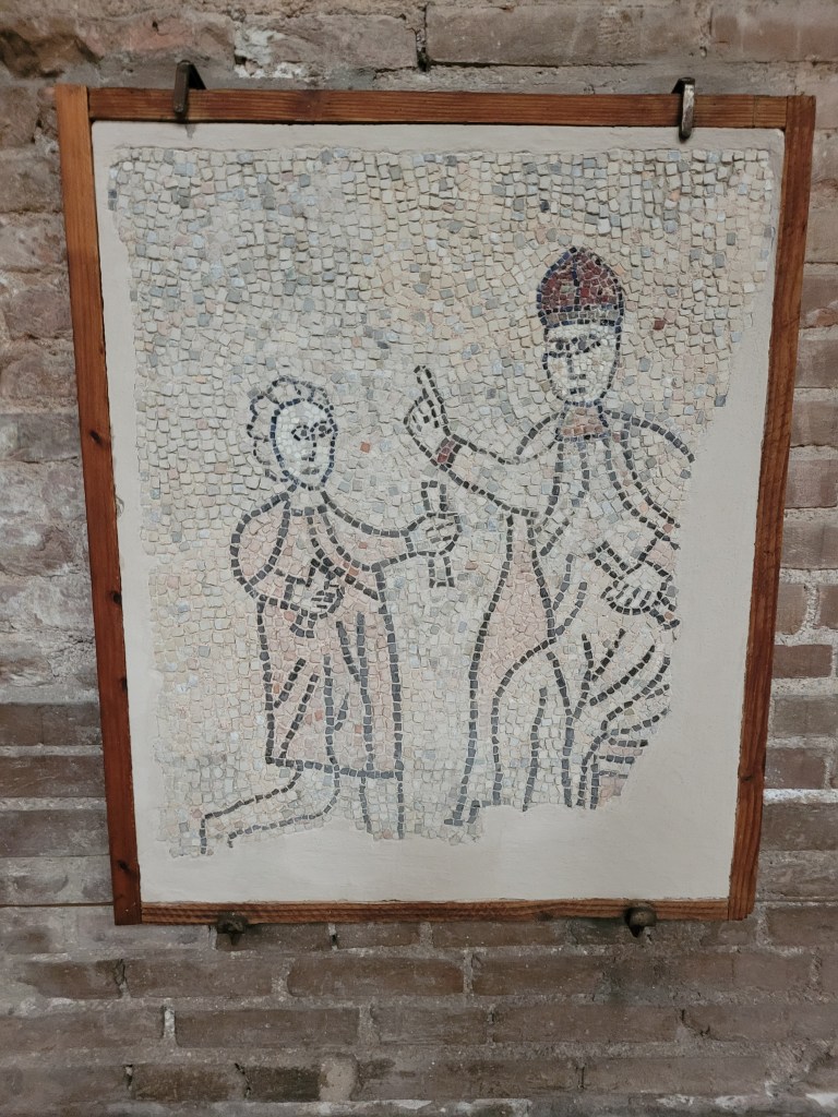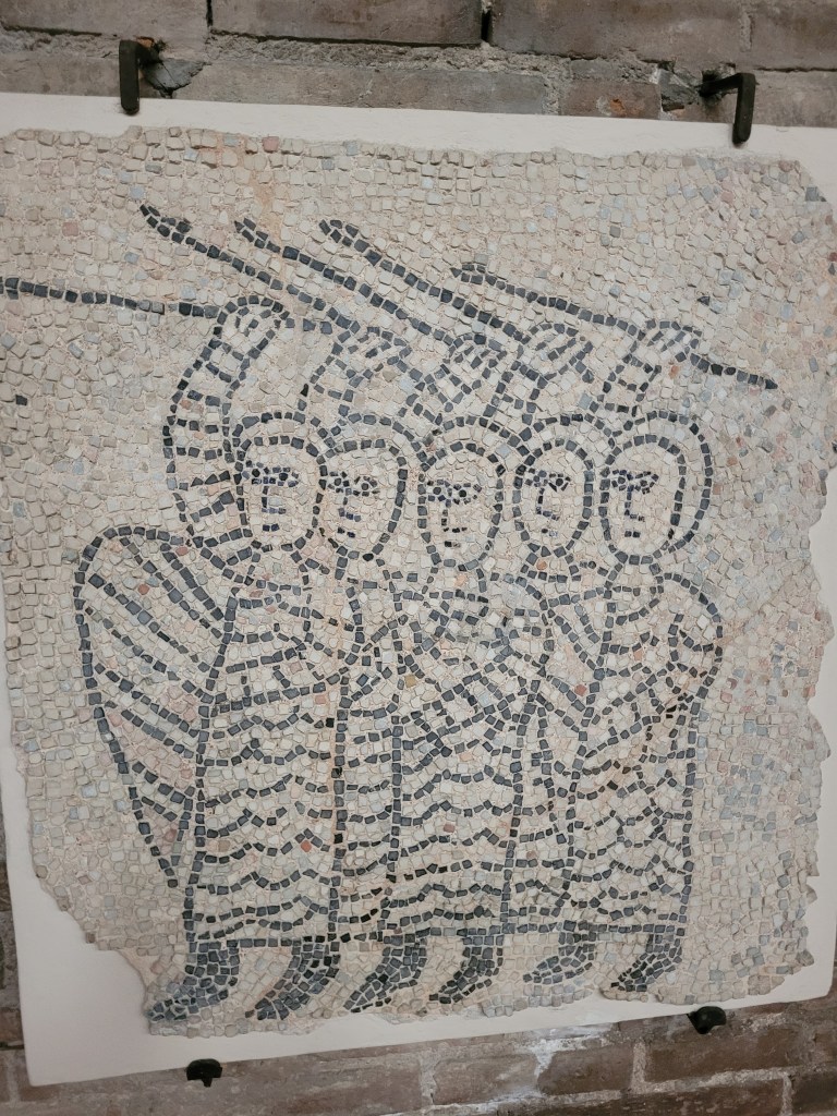 My final word on mosaics is about those found in San Giovanni Evangelista. This was one of the earliest churches in Ravenna and, like the rest of them, had been generously decorated with Byzantine mosaics. These were removed in the 16th century and have, mostly, been lost. The church stood until an Allied bombing raid during WW2, when it was destroyed. During the rebuilding, the thirteenth century floor of the nave was resurrected and placed in panels on the walls of the church. They depict scenes from the disastrous Fourth Crusade, when Constantinople was sacked.