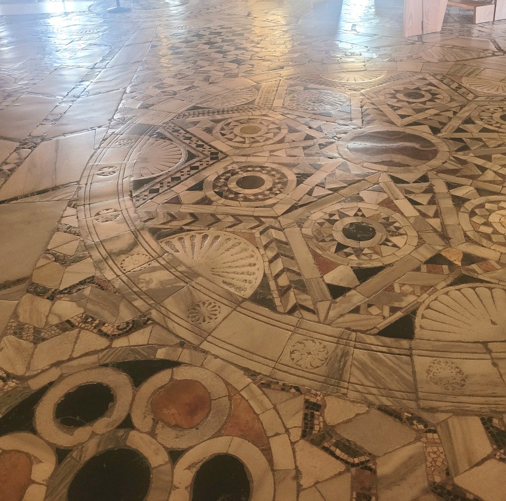 But it’s worth noting that the floors are also original (well, in most places) and of different types of mosaic. There are the small piece mosaics (what I think of as ‘Roman’ mosaics) on most areas and also the larger piece ones (which date from the same period) which are used in the area under the central dome. Apparently the Romans didn’t just use little bits of tile, they also used big bits.