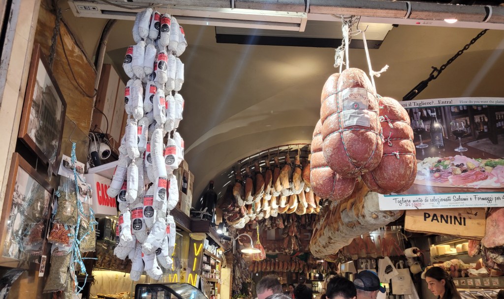 The salumeria across the square (the blue building) captured my attention so we went there instead, dropping a large sum of money on salami and cheese (a significant sum) in the process.