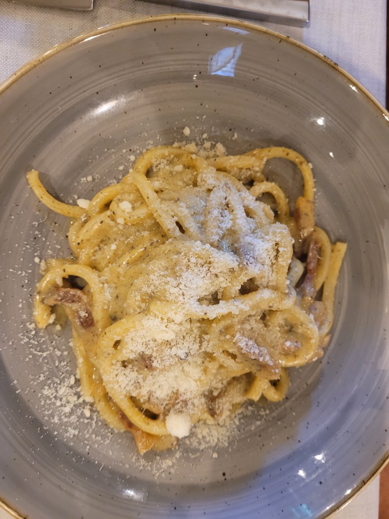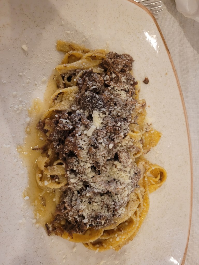 The pasta was homemade: Roger had something that Google translated as ‘worms’ (fat spaghetti, it transpired) alla Carbonara with added truffle while I had the slow cooked, shredded pork on tagliatelle – both sensational.