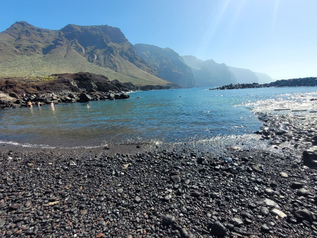The coastline is incredibly rocky, the cliffs are dark and the beaches are covered in black pumice pebbles.