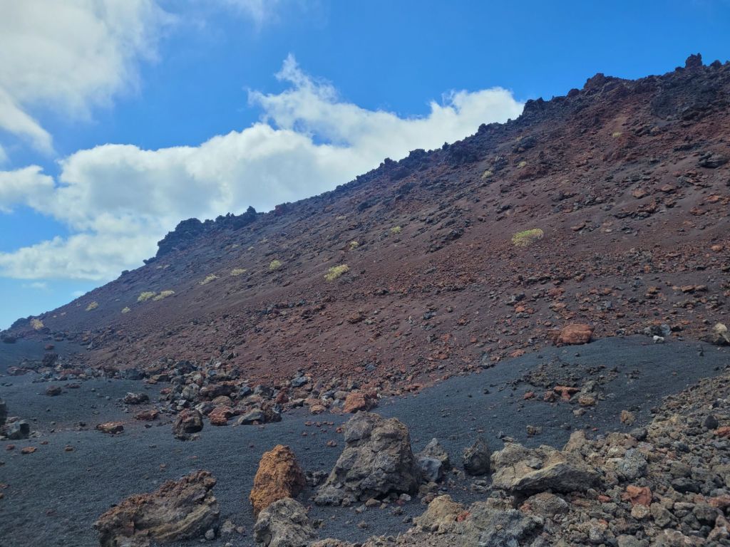 Well, yes and no. It was downhill but very steep in places and it’s all on ash or coarse sandy lava, so it’s a bit slippery. Thankfully, we had left the walking sandals in the car and chosen proper footwear with good treads – we still slid about at times.