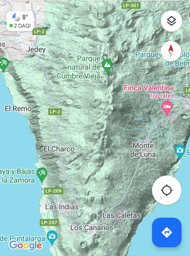 However, having thrashed through (well, skimmed) a few dense articles (and some very superficial ones) that Professor Google suggested, I think (THINK) I am correct in saying there is one dormant, very old volcanic region occupying the northern third of the island – the Taburiente region. This looks exactly like what you expect a volcano to look like on Google maps.