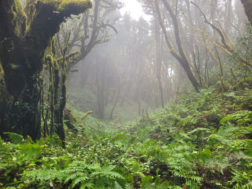This means that the microclimate is colder by between 6-12 centigrade from sea level, depending on the sun, and it’s very, very wet. And misty.