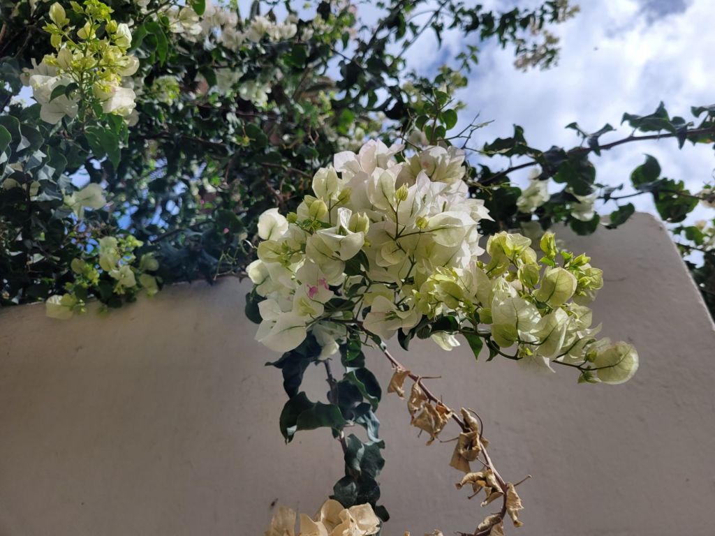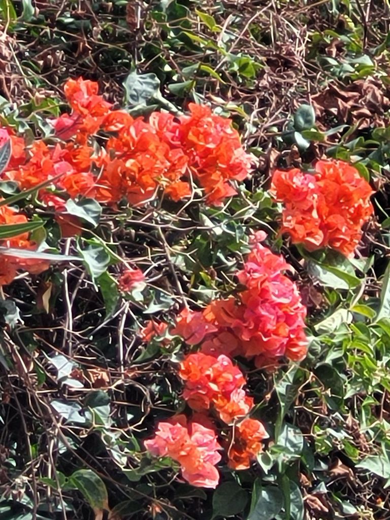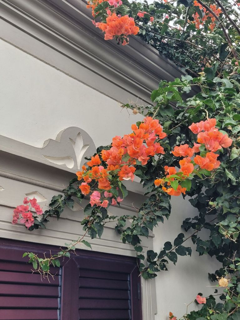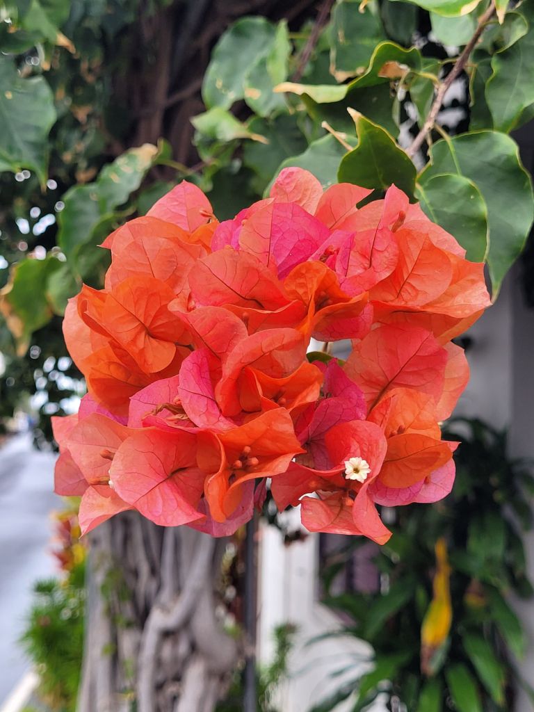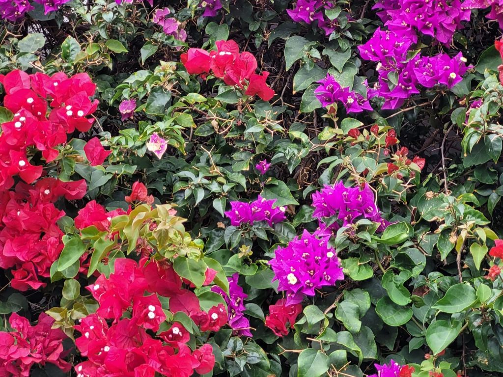 Bougainvillea has spread widely and spontaneously hybridised into shrubs that can bear multiple colours on one branch. They can be clipped into a hedge, controlled and shaped (although formal topiary is probably beyond them) and left to burst over balconies, walls and even abandoned machinery. I adore them.