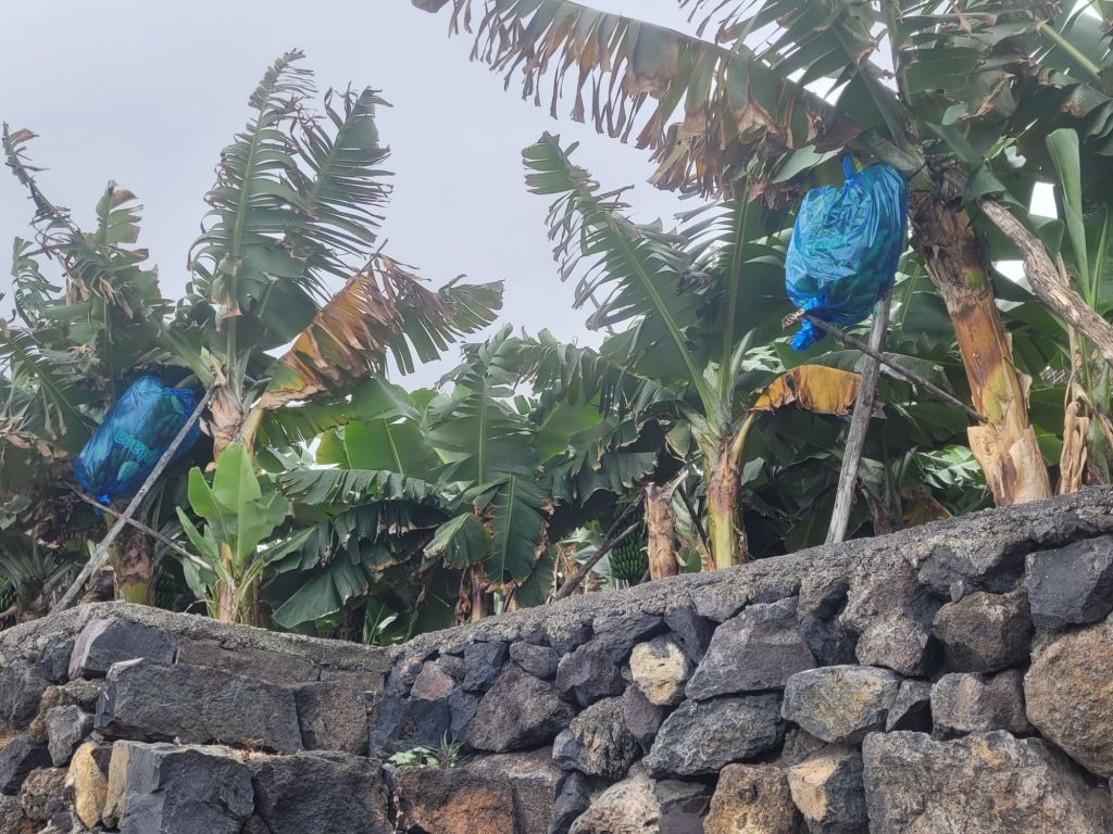 Bananas only grow at low altitudes – so by the sea – which, in turn, means wind. So they need protection. Initially this was done by raising the plants in walled ‘fields’: walls with air bricks around the top third to allow for air flow. The bricks are varied in design, some just holes, some more ornate (probably the older ones). Then they discovered plastic netting.