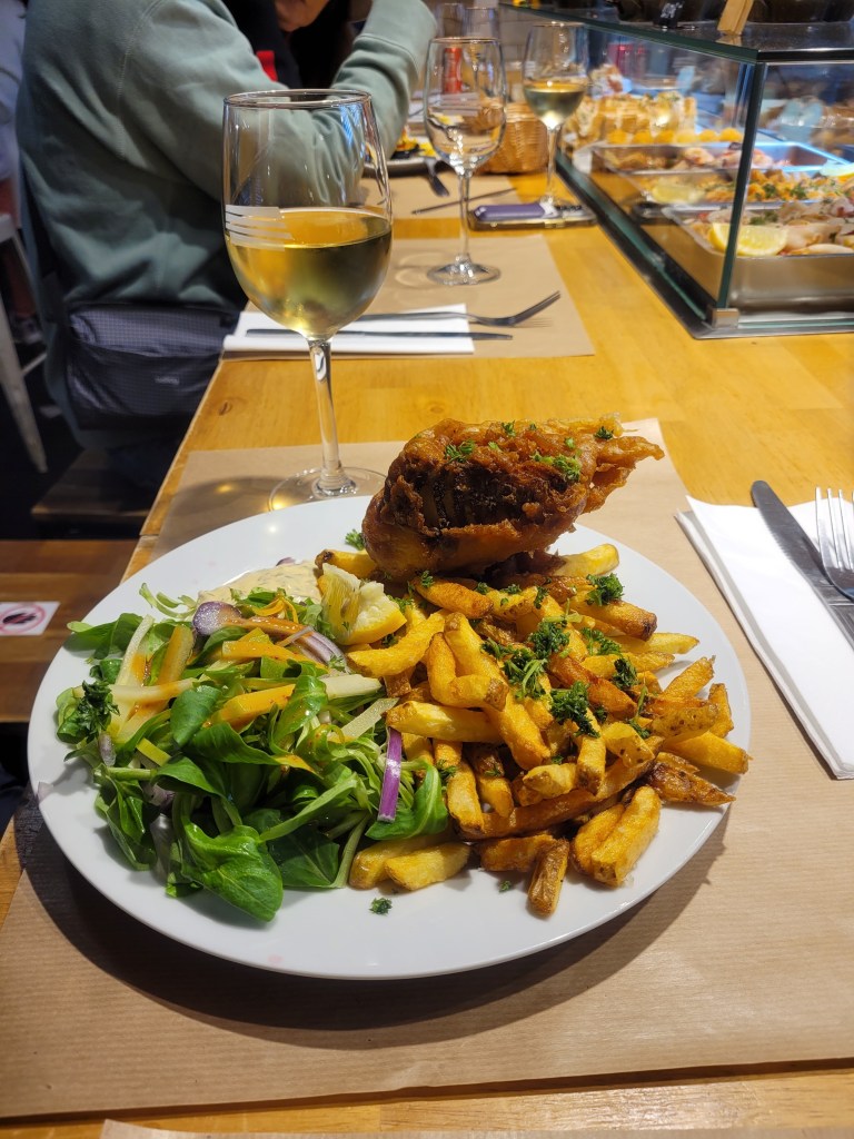 Le Requins Marteaux (poissonerie dinatoire) was amazing. Roger had ‘traditional’ cod and chips – he said if cod and chips were that good in the UK he would eat it every week – and I had a tuna tartare salad (and chips). The tuna had a tasty wasabi, ginger and pomegranate seed dressing (the crunchy pomegranate seeds provided a nice contrast to the raw tuna), the chips were thin and crispy and a nice glass of local white (no idea what it was but it was light and fresh) washed it all down nicely. Something that we both commented on was how nice the salad was: clearly intended to be eaten rather than just plonked on the plate as garnish.