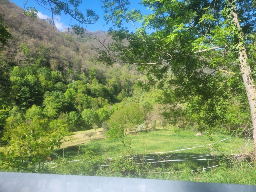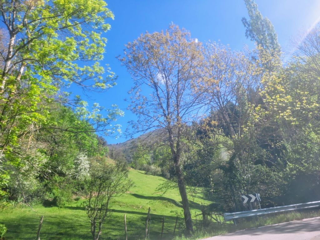 Following the road north, back to Potes, we turned east up the valley formed by the river Bullon and as we moved away from the Picos, the landscape became less rocky, if no less lovely. Against the bright blue sky everything glowed with colour: older, leathery dark green growth softened by feathery tender bright green shoots while brassy bronze greens sharply contrasted acid lemon yellows.