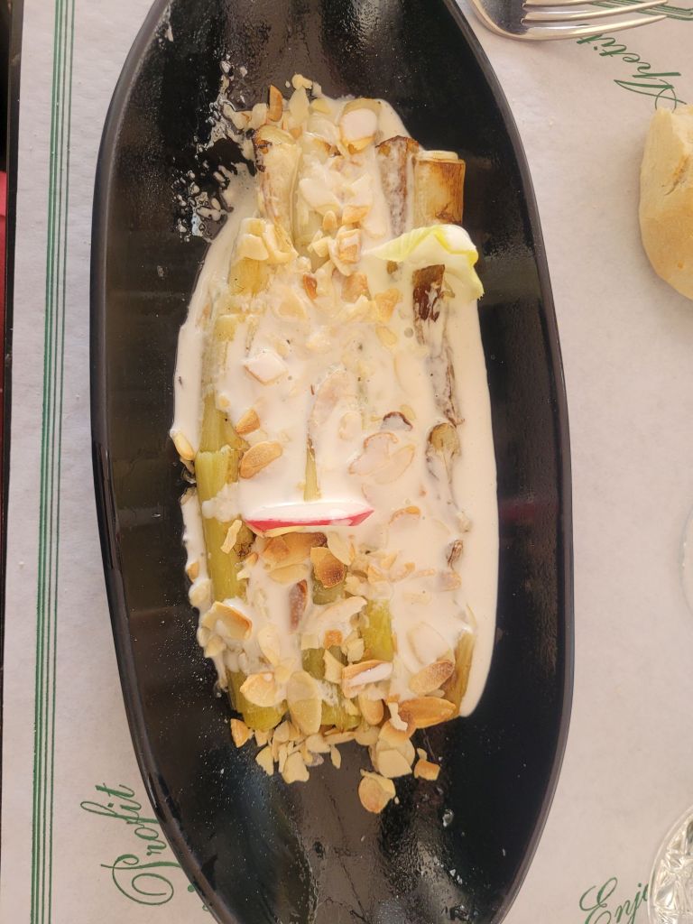 On the whole the food has been good – some better than others. My stand-out dish by far in La Rioja was the starter I had in Logrono at La Cocina de Ramon: roasted baby leeks with toasted flaked almonds and an almond cream (just almonds and water). The combination of the sweetness of the leeks and almonds was offset by the flakes of salt sprinkled across the top. Totally unexpected and utterly delicious.
