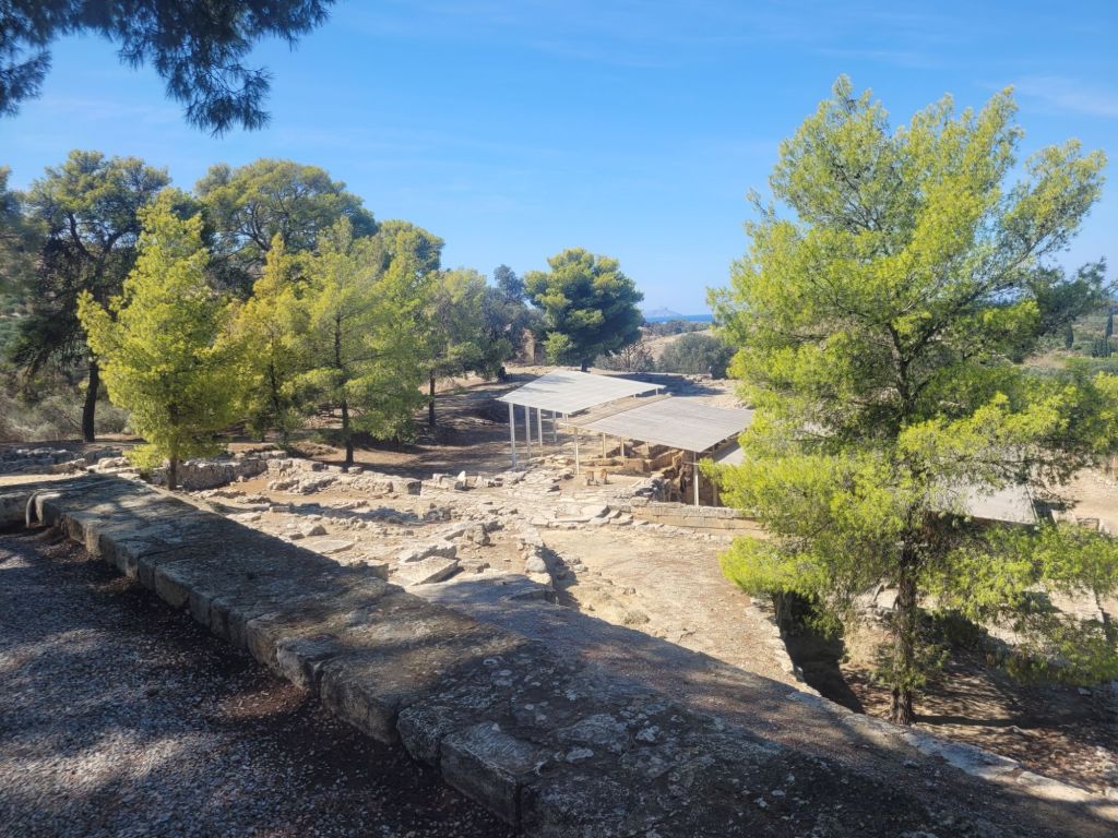 Close to Phaistos (a seven minute drive west over the hill and along yet another very narrow road) is Agios Triada, a smaller Minoan palace site. This is much less visited, has no signage whatsoever, is still being excavated and is in a wildly atmospheric location. Like other palace sites it stands on a promontory, surrounded by olive groves and pine trees; originally the sea would have lapped much closer to the bottom of the hill. It takes its name from the village which surrounded it, which was destroyed by the Turks in the late 1800s; the Minoan name of the site is unknown.