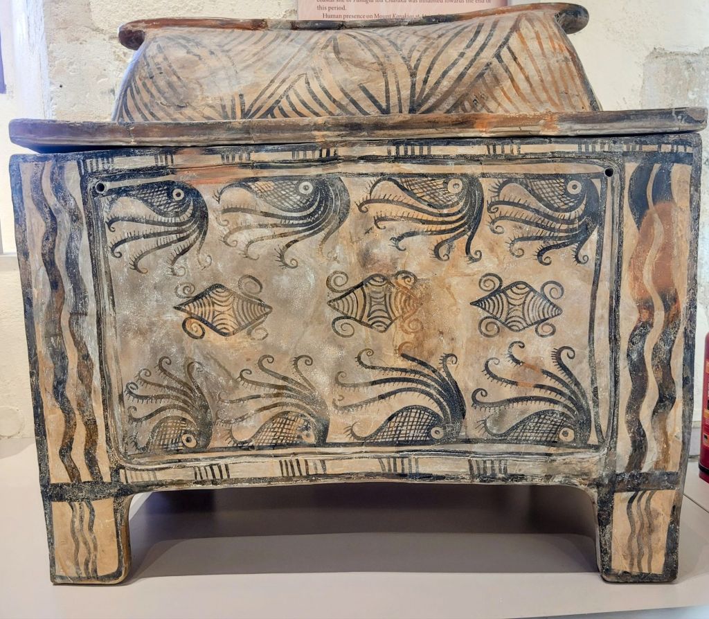 Phaistos was excavated at around the same time as Knossos, but by an Italian team. Finds included a particularly delicate and fine style of pottery called Kamares ware (after the Kamares cave in the Psiloritis mountain where it may have been made). One significant find was the Phaistos Disk, a ceramic disk with a different spiral pattern of seals embedded on each side. It remains undeciphered. Because of its excellent condition, there were rumours suggesting it was a fake but current scholarship and testing would suggest otherwise. Sadly I have no photos as it was in the ‘no photography’ museum, however T-shirts with a representation of it can be found (Roger now has three).