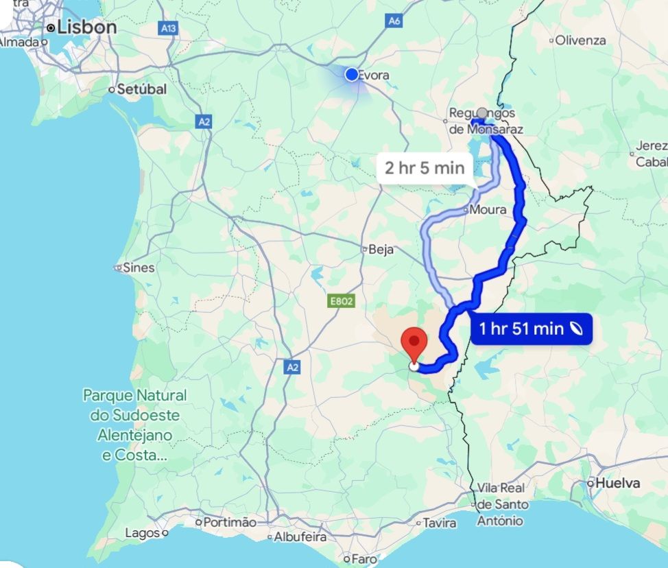 As the road climbed gently out of Mertola, the fog burned off leaving a sparkling blue sky. Gently rolling, stony scrubland gave way to flatter, more fertile pastures – sheep, goats, cattle. There were fields full of what looked like holm oaks, but not a pig in sight.