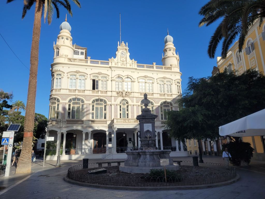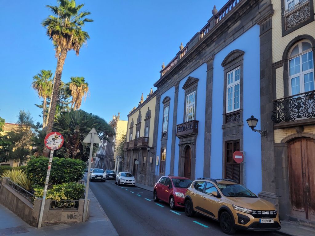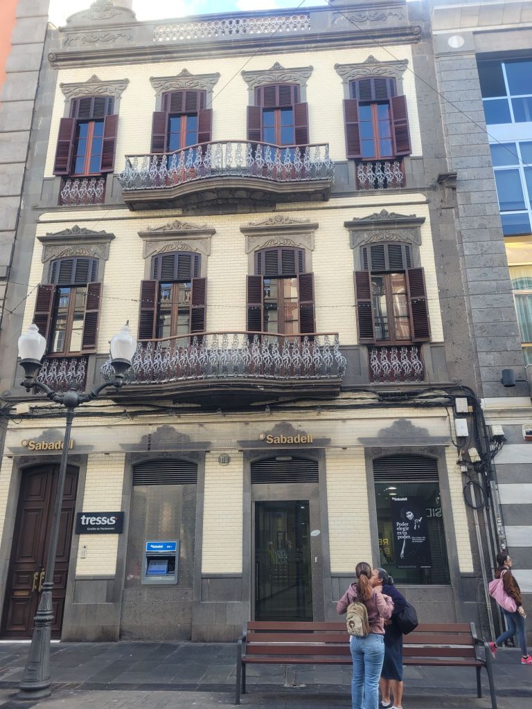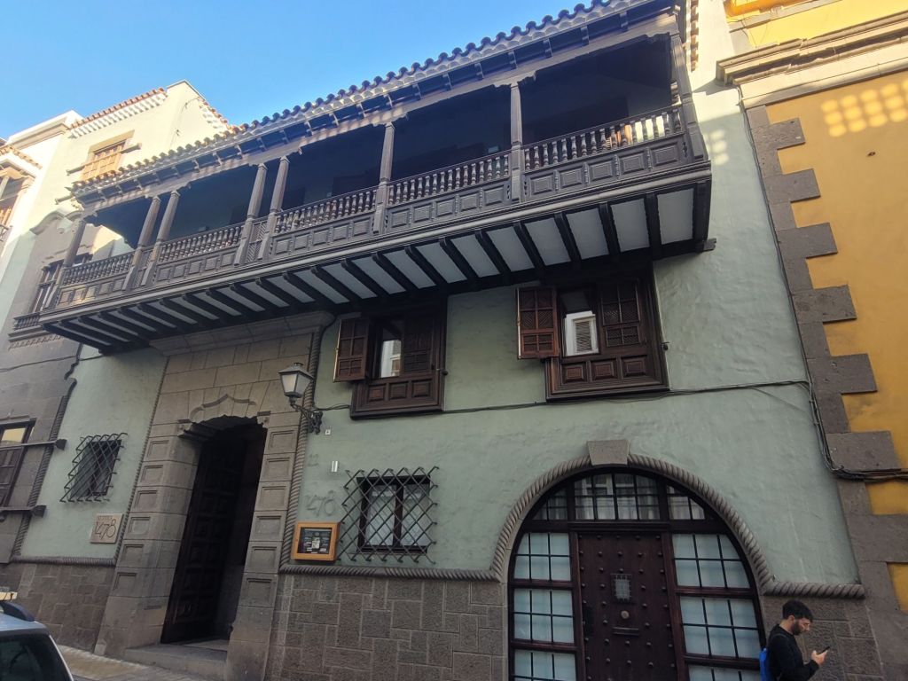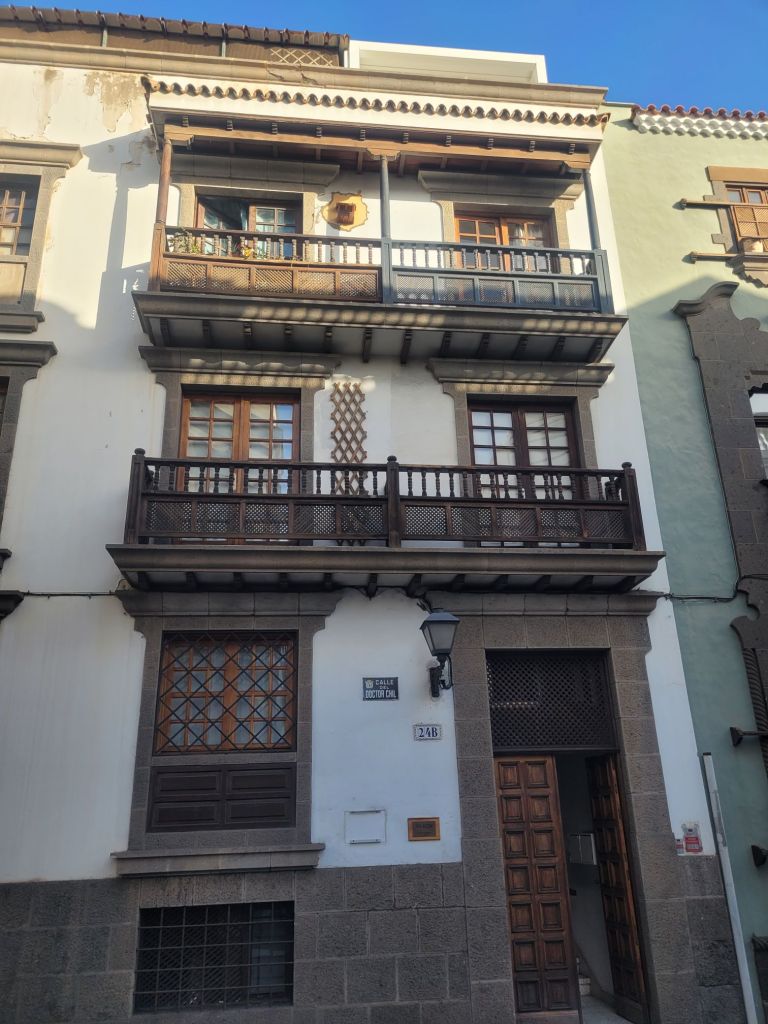 The old town is a mixture of styles, from classic colonial Spanish (wood or stone around openings, monumental doorways, white wash walls…), Canary Island architecture (more wood, less stone, wooden balconies…) and what I think is called ‘Art Nouveau’ – or ‘Art Moderne’? Some buildings look similar to those turn of the 20th century buildings in Barcelona. There is a mix of colours, a nice series of bars and restaurants (we ate well), some pretty (if small) open spaces and two excellent museums.