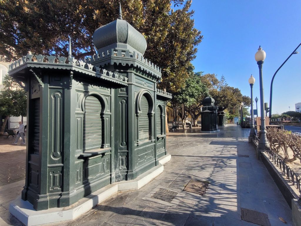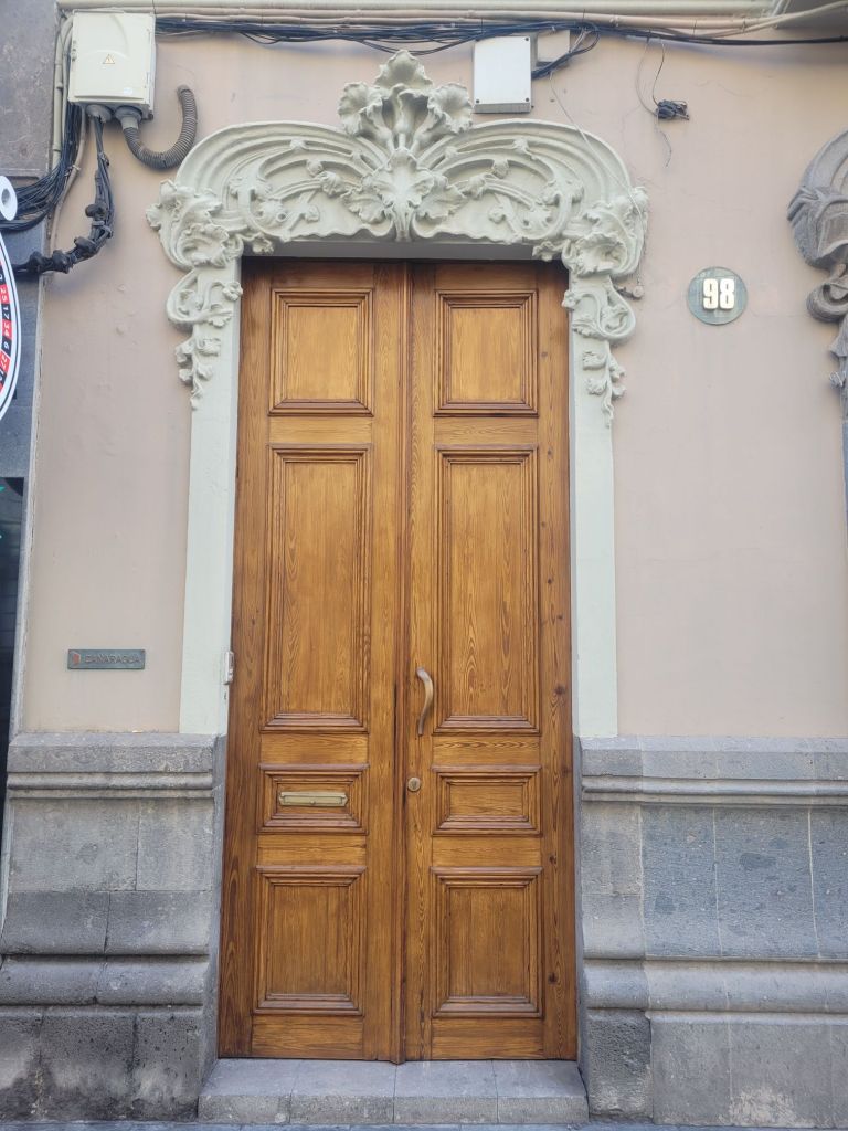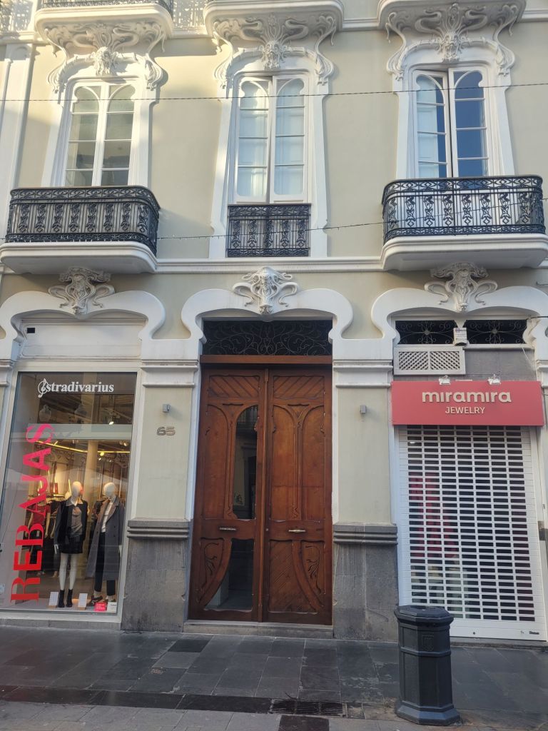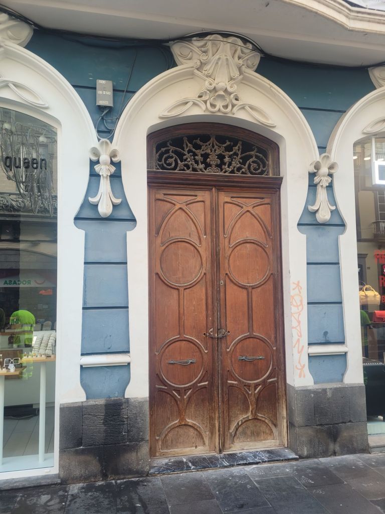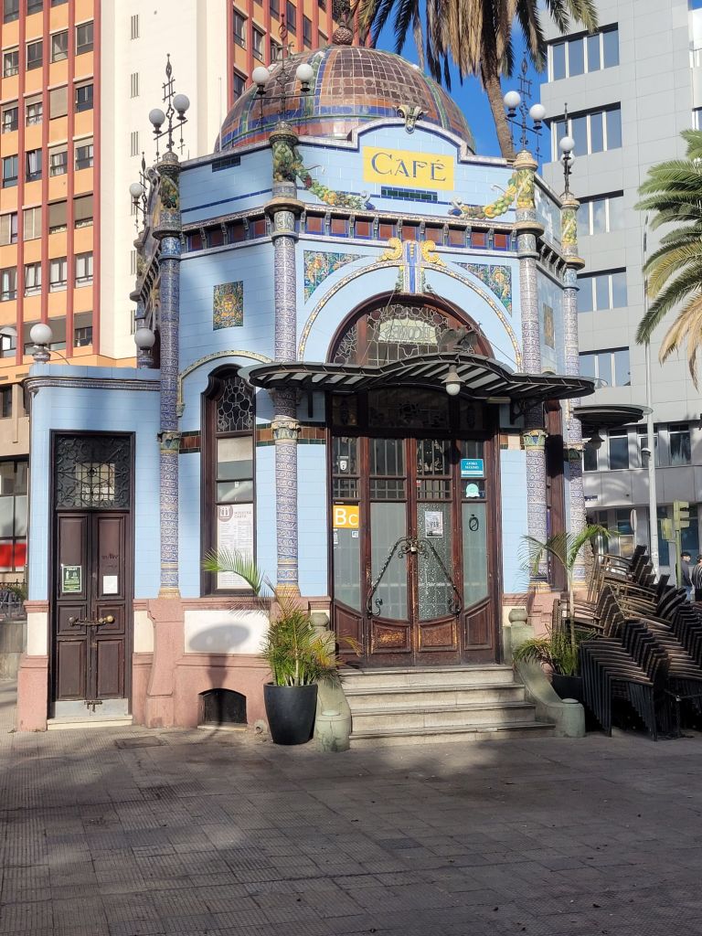 The old town is a mixture of styles, from classic colonial Spanish (wood or stone around openings, monumental doorways, white wash walls…), Canary Island architecture (more wood, less stone, wooden balconies…) and what I think is called ‘Art Nouveau’ – or ‘Art Moderne’? Some buildings look similar to those turn of the 20th century buildings in Barcelona. There is a mix of colours, a nice series of bars and restaurants (we ate well), some pretty (if small) open spaces and two excellent museums.