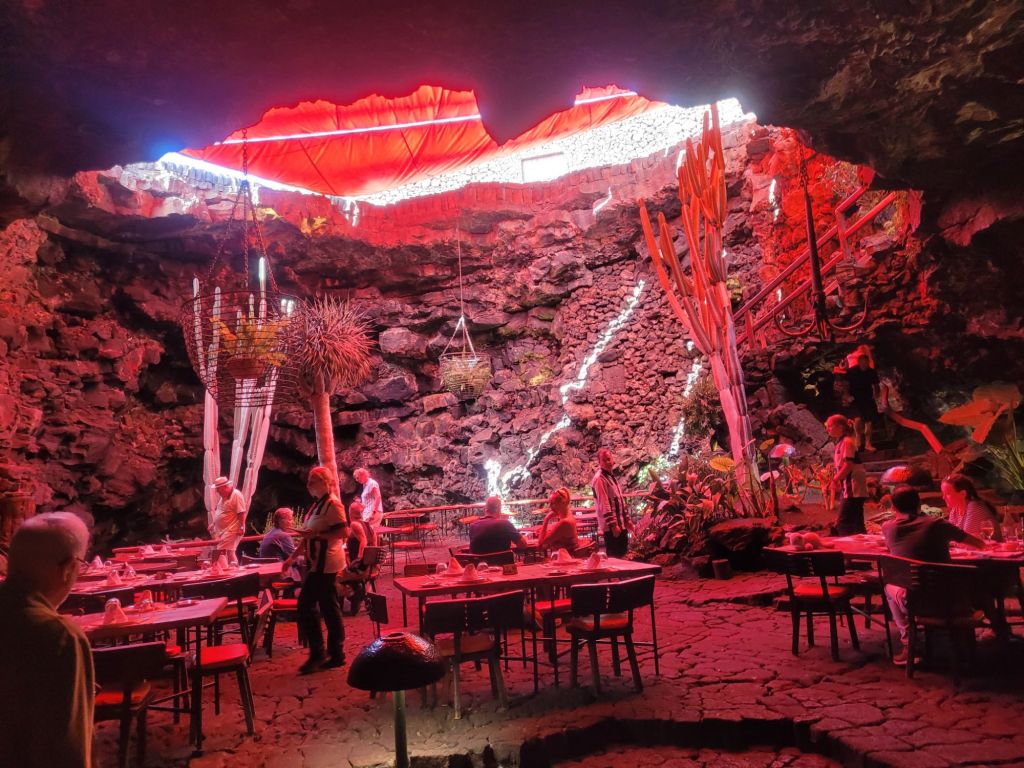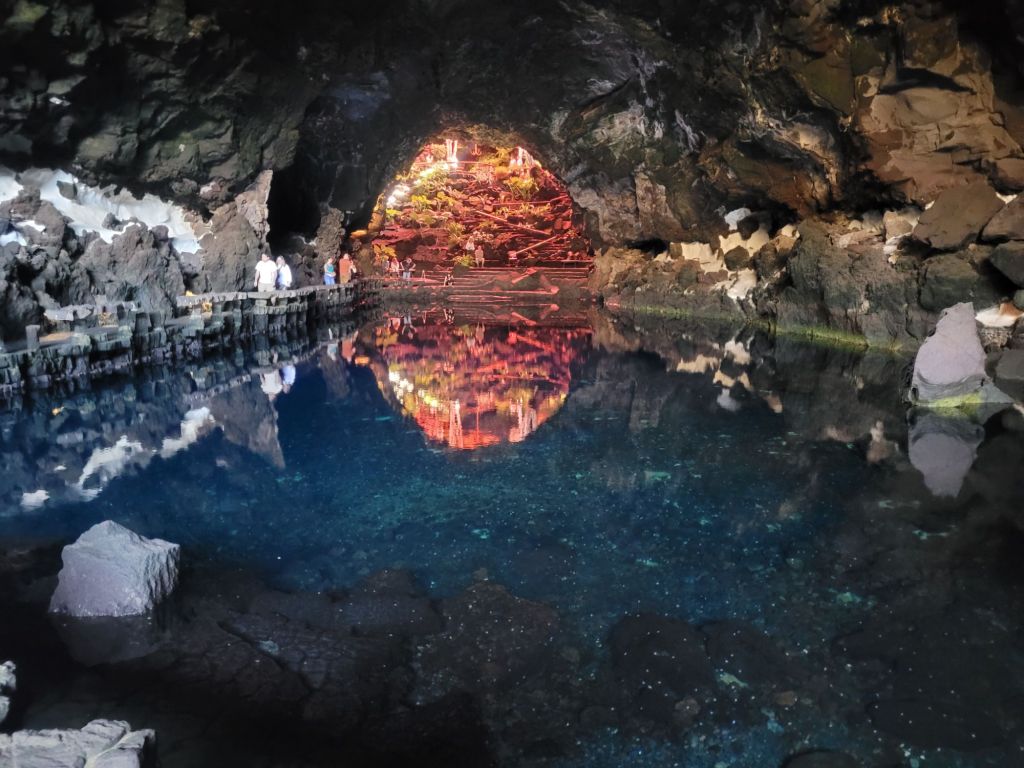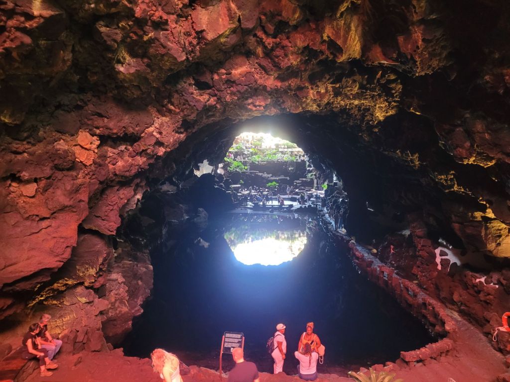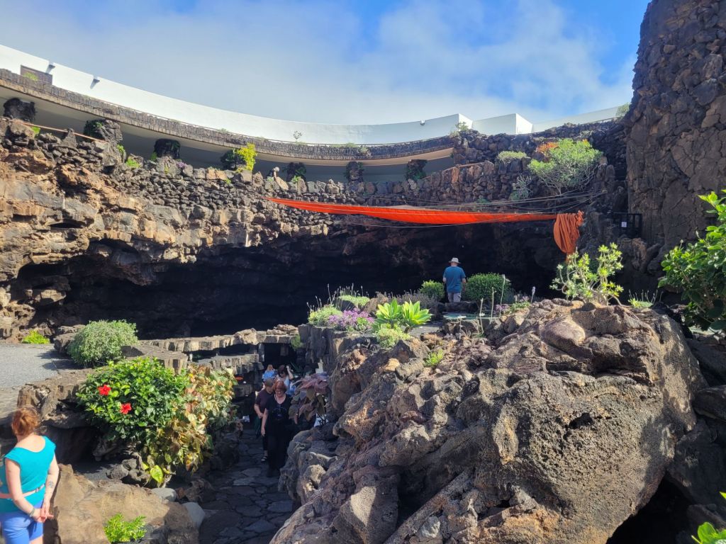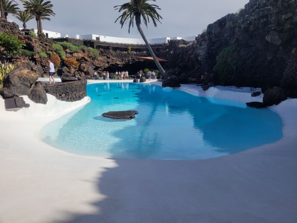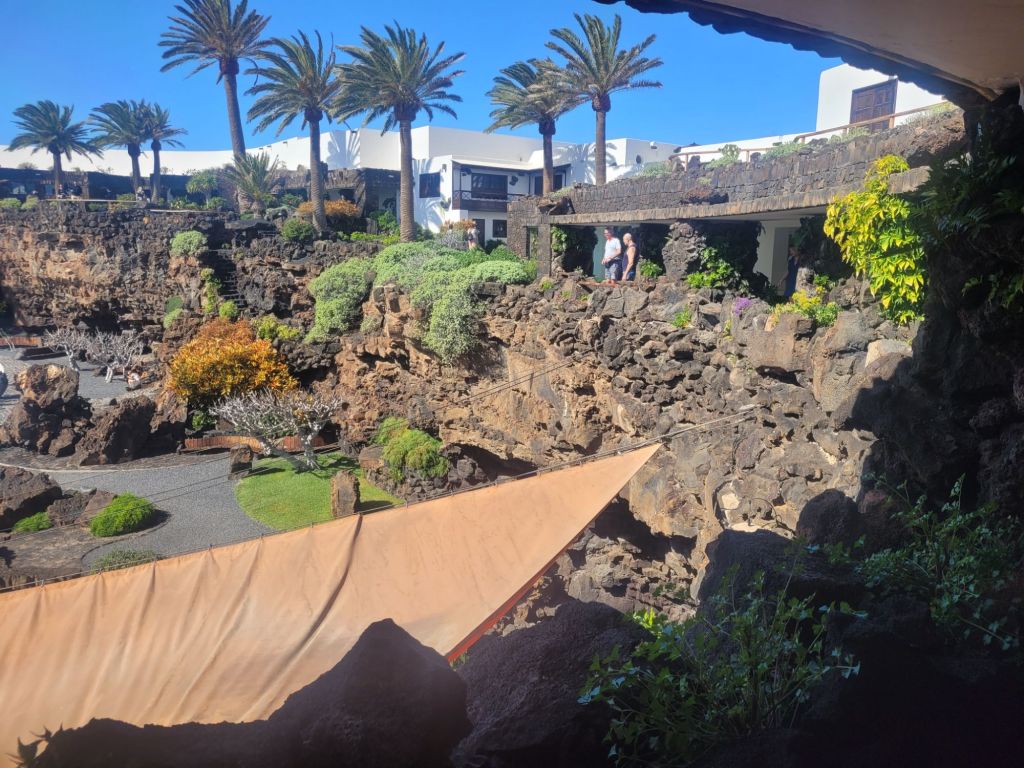 The symbol of Jameos del Agua is a lobster; this represents the white cave lobsters that live in the underground lake. They are tiny and we both thought they were debris when we looked into the water. There are warning signs about throwing anything at all into the water, but particularly coins (why oh why do people insist on chucking money into a standing body of water).