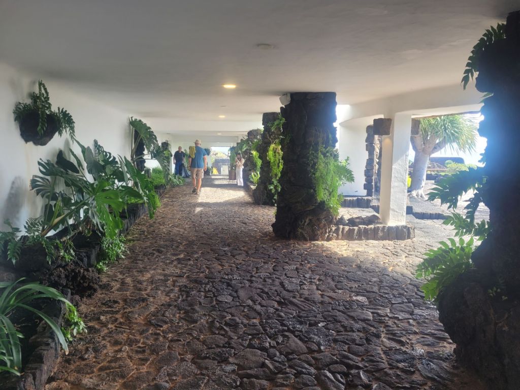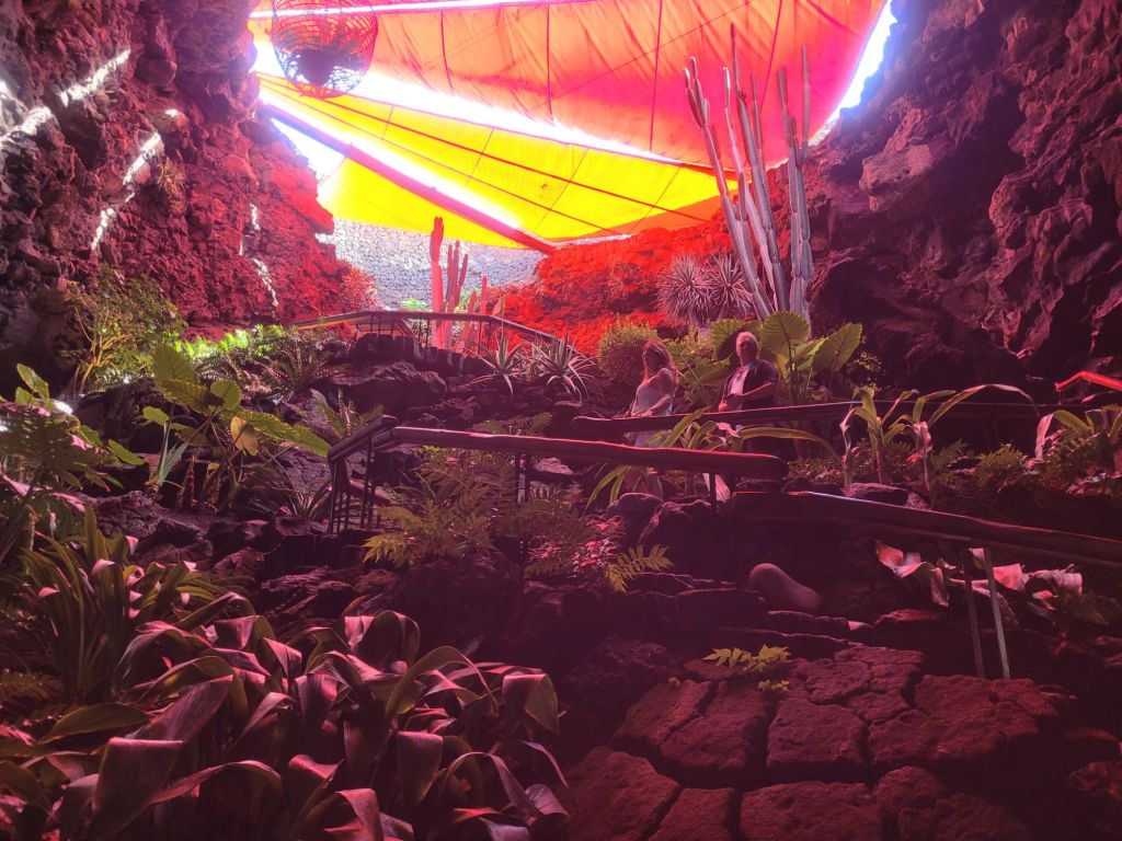 Jameos del Agua gets its name from a Maho word for ‘capsized roof of a lava cave or tube’ – although I am unsure of whether it’s just the ‘capsized’ bit or all of it. The lava structure in question was formed by the explosion of La Corona volcano and also features in Cueva Verde, just up the road from Jameos del Agua. Manrique took a massive sink hole, an underground lake and some collapsed tunnel and made a pleasure garden come entertainment space out of it: it is stunning. Small, but stunning. Everything is done to enhance the feeling of being in a grotto; to us, it felt slightly like Gaudi’s Parc Guell in Barcelona – consciously sculpted but very organic.